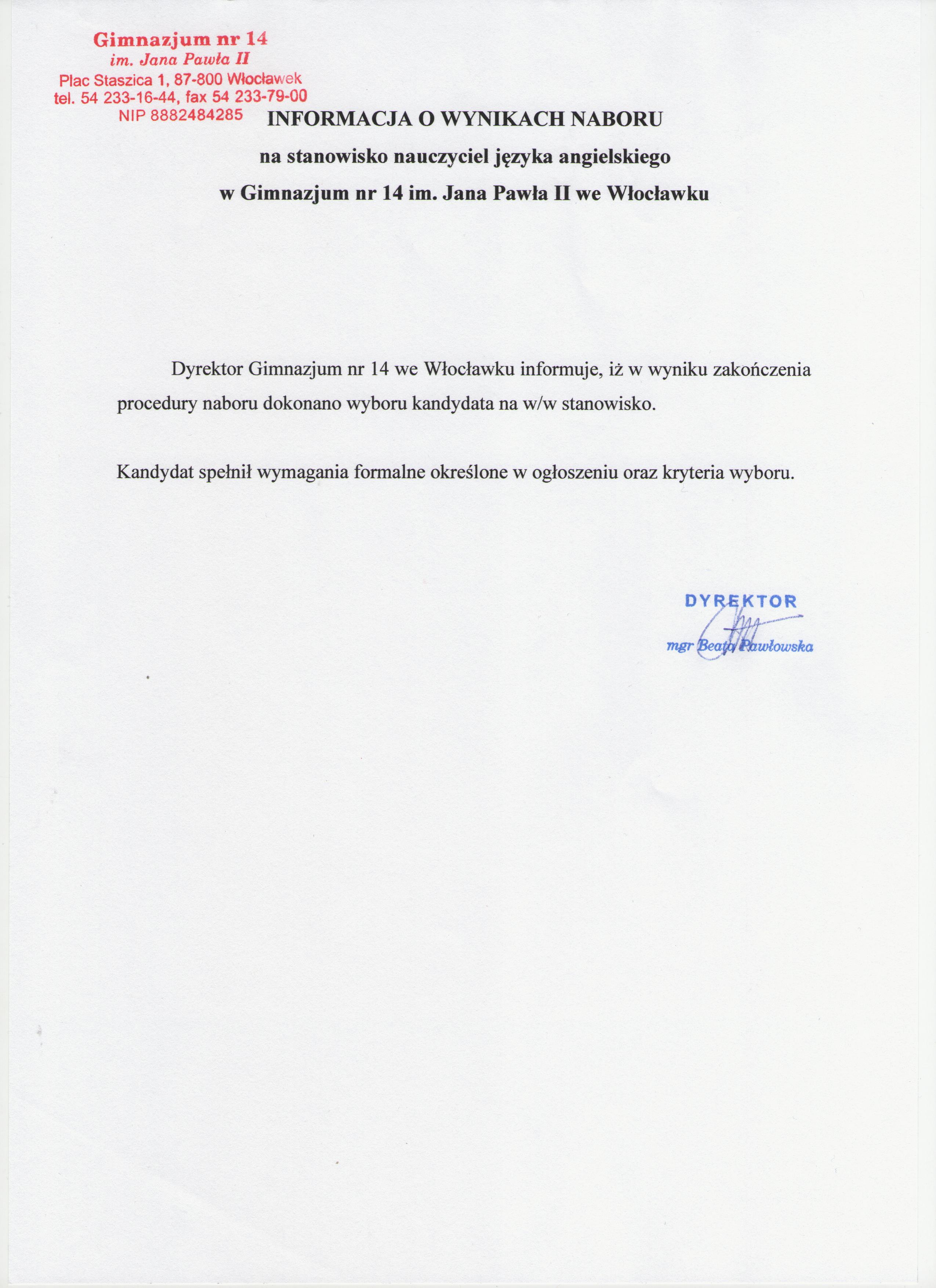 | Informacja o wyniku naboru | dodany: 17:55, 13.02.2017 | przez: Beata Szczerbiak |