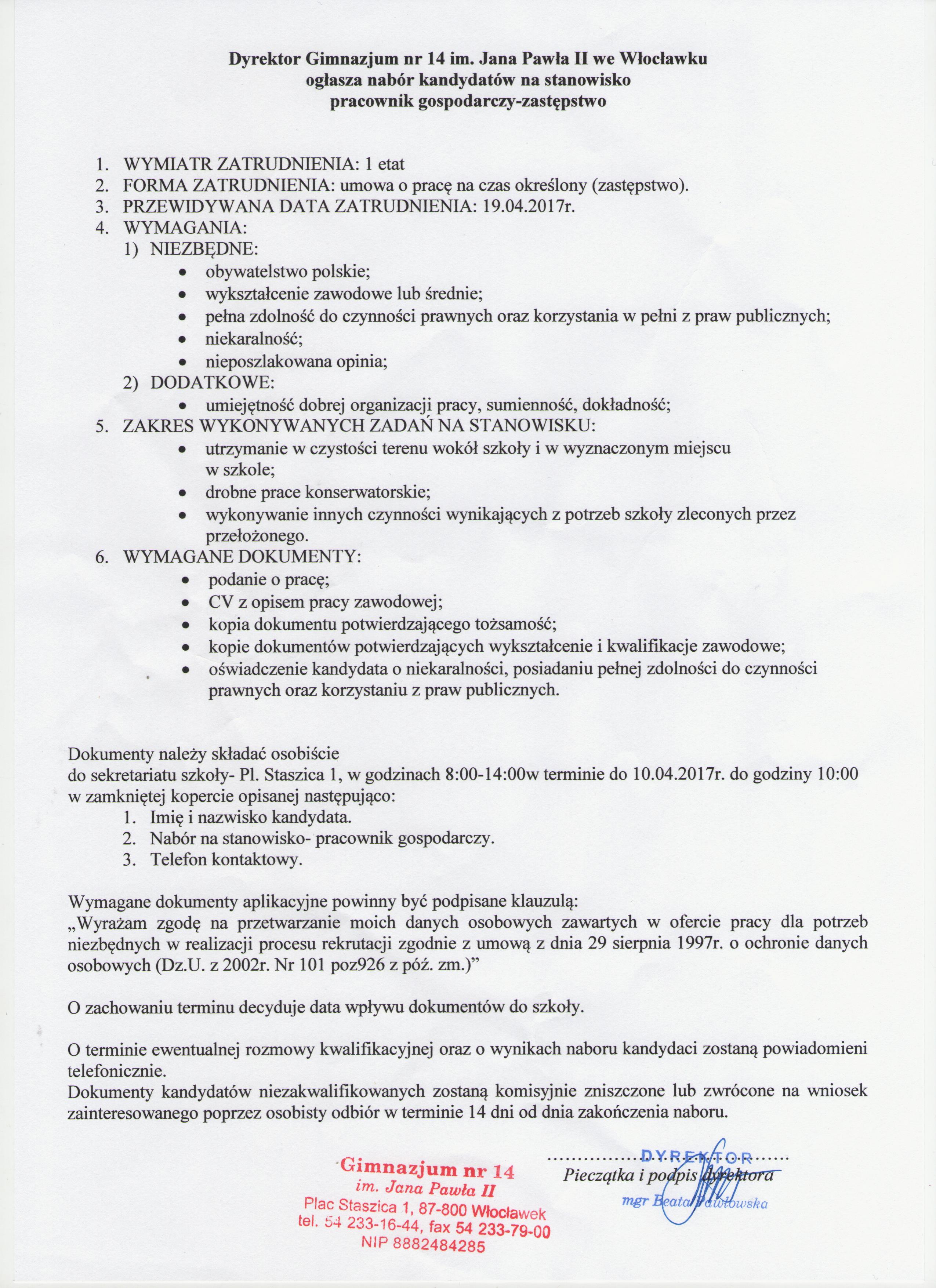 Pracownik gospodarczy w Gimnazjum nr 14 we Włocławku